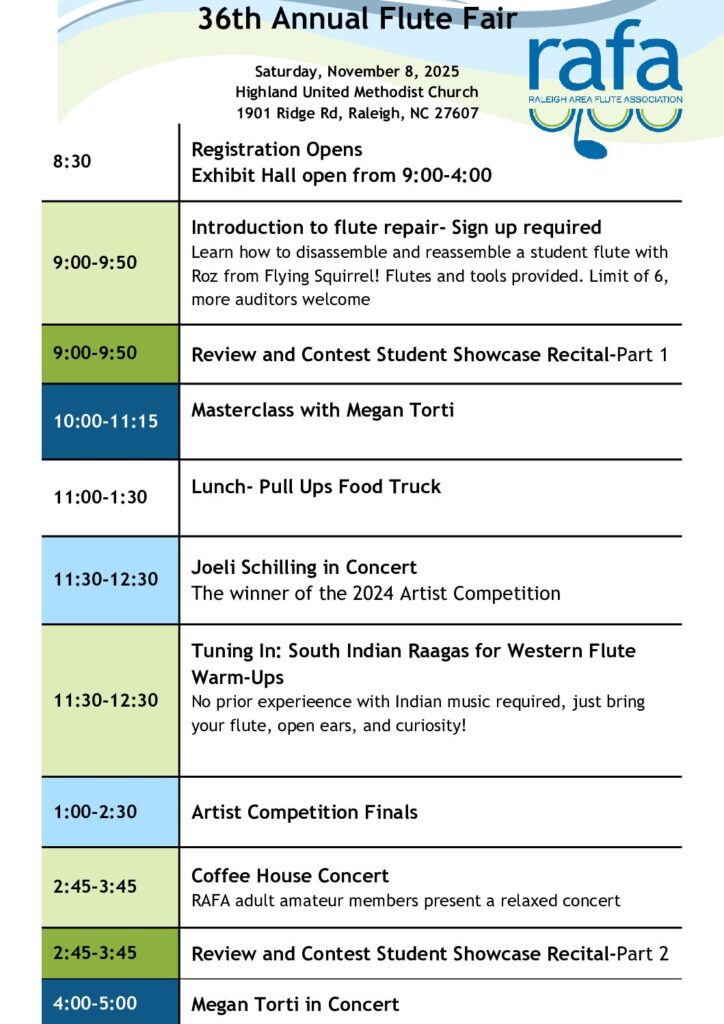 The day’s offerings will include the Final round of the 10th annual RAFA Artist Competition and the Student Showcase recitals featuring winners of the 2025 Review and Contest. Vendors will be on site with flutes and accessories for sale.